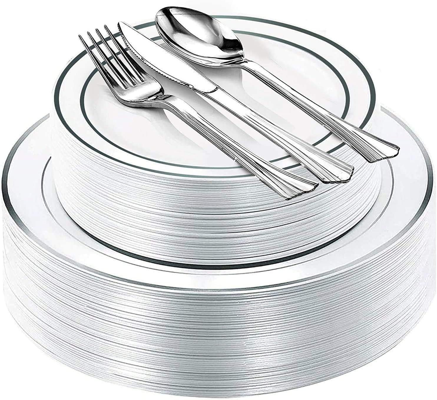 *NEW* Fancy Disposable Plastic Plates with Cutlery 150 Piece Combo| 30x 10.25″ + 30x 7.5″ Real China Silver Rim Plates +30 Spoons +30 Forks +30 Knives for $26.99 –$2 coupon on the product page = just $24.99!