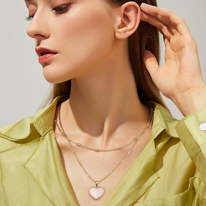 O.SECERT Gold Layered Heart Necklaces for Women, Mother of Pearl Pendant Necklace, 18K Gold Plated Flat Snake Chain | Beaded Chain Gold Layering Necklaces for Women Girls