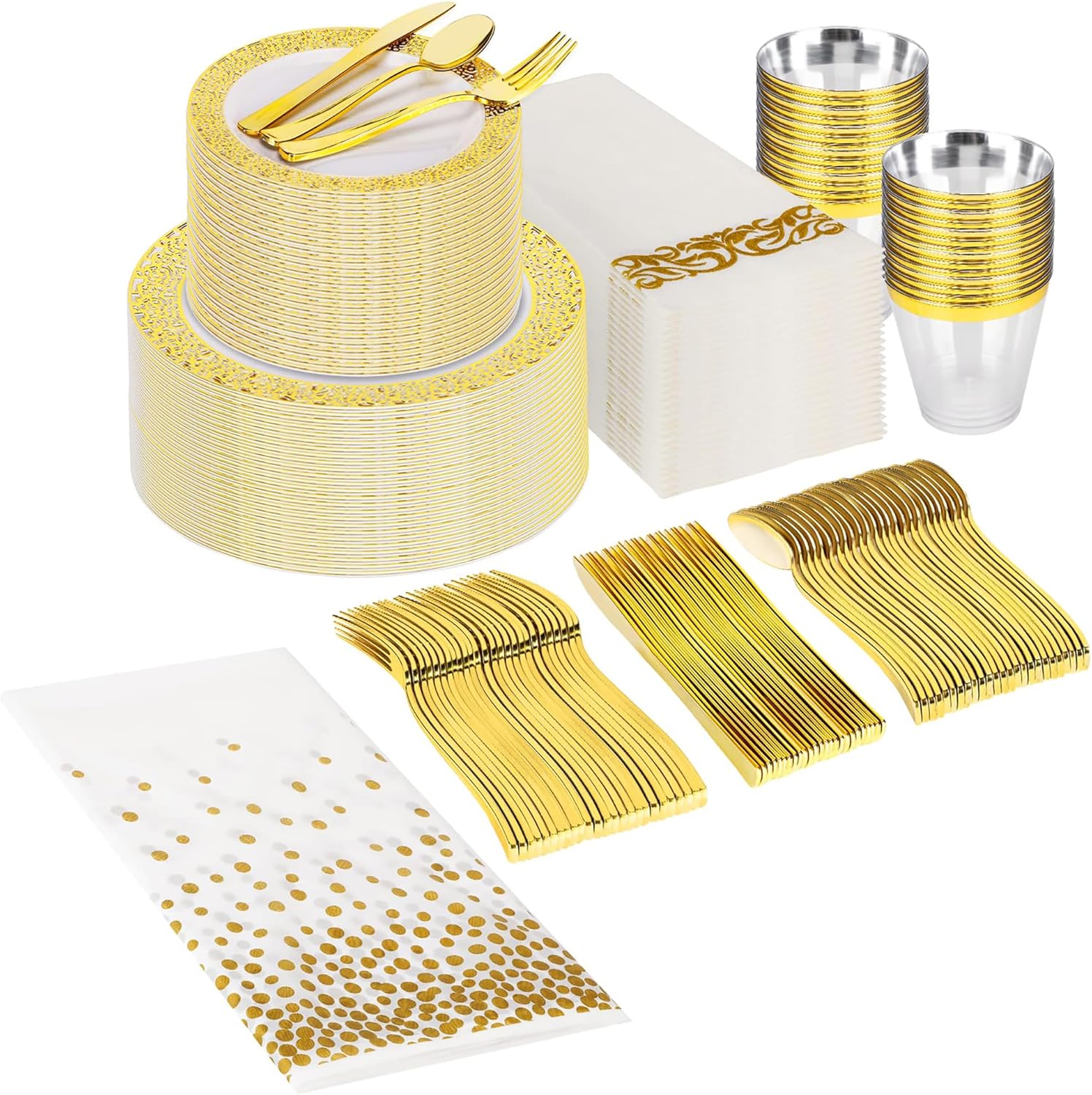 Disposable Golden Dinnerware Set 176 Piece – 50 Golden Plastic Plates – 25 Golden 9oz Cups – 25 Golden Silverware – Table Cloth and 25 Linen Golden Paper Napkins for 25 Guest just $21.95! 3 Colors
