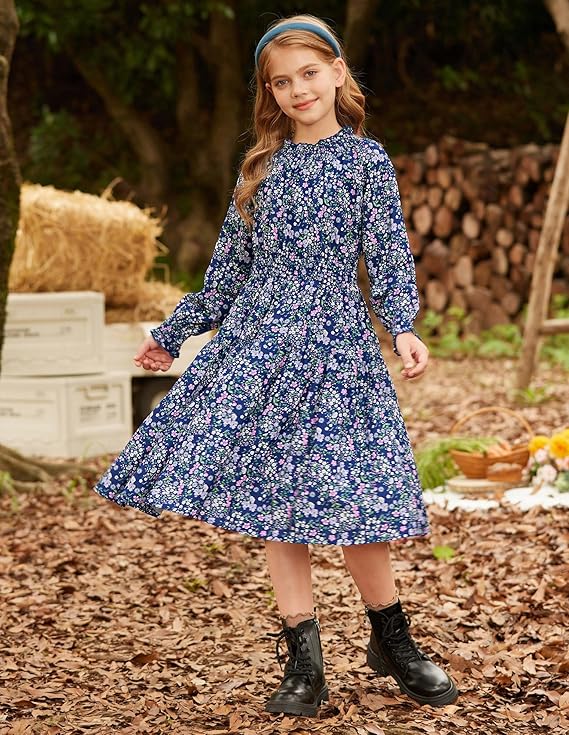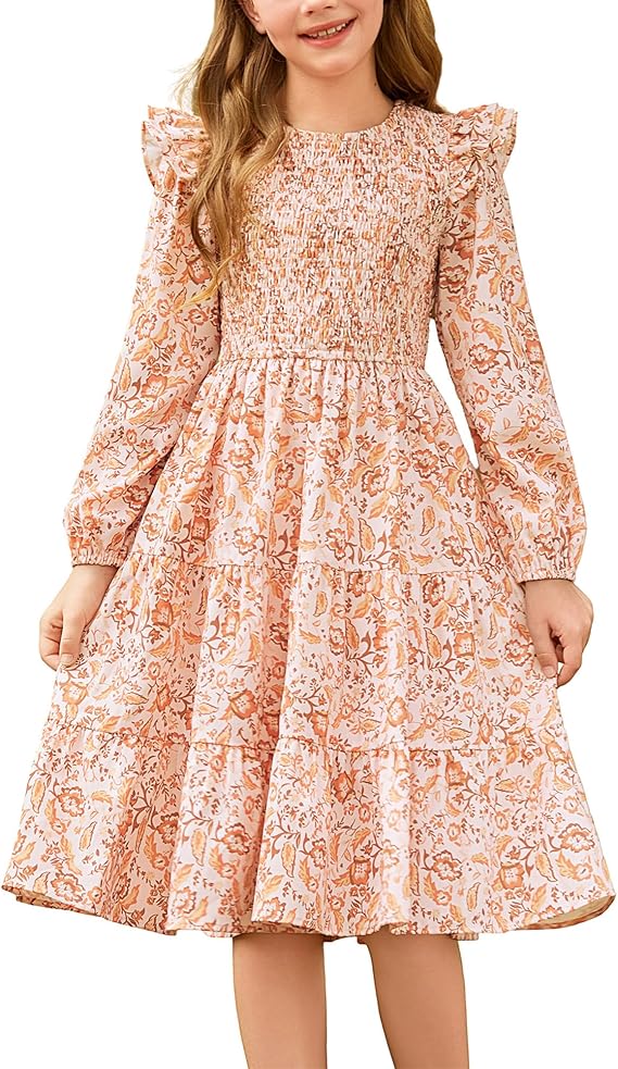 GRACE KARIN Girls Long Sleeve Fall Floral Dress Ruffle Round Neck Smocked Layered Hem just $27.99! 3 Options, Sizes 5T – 12 years