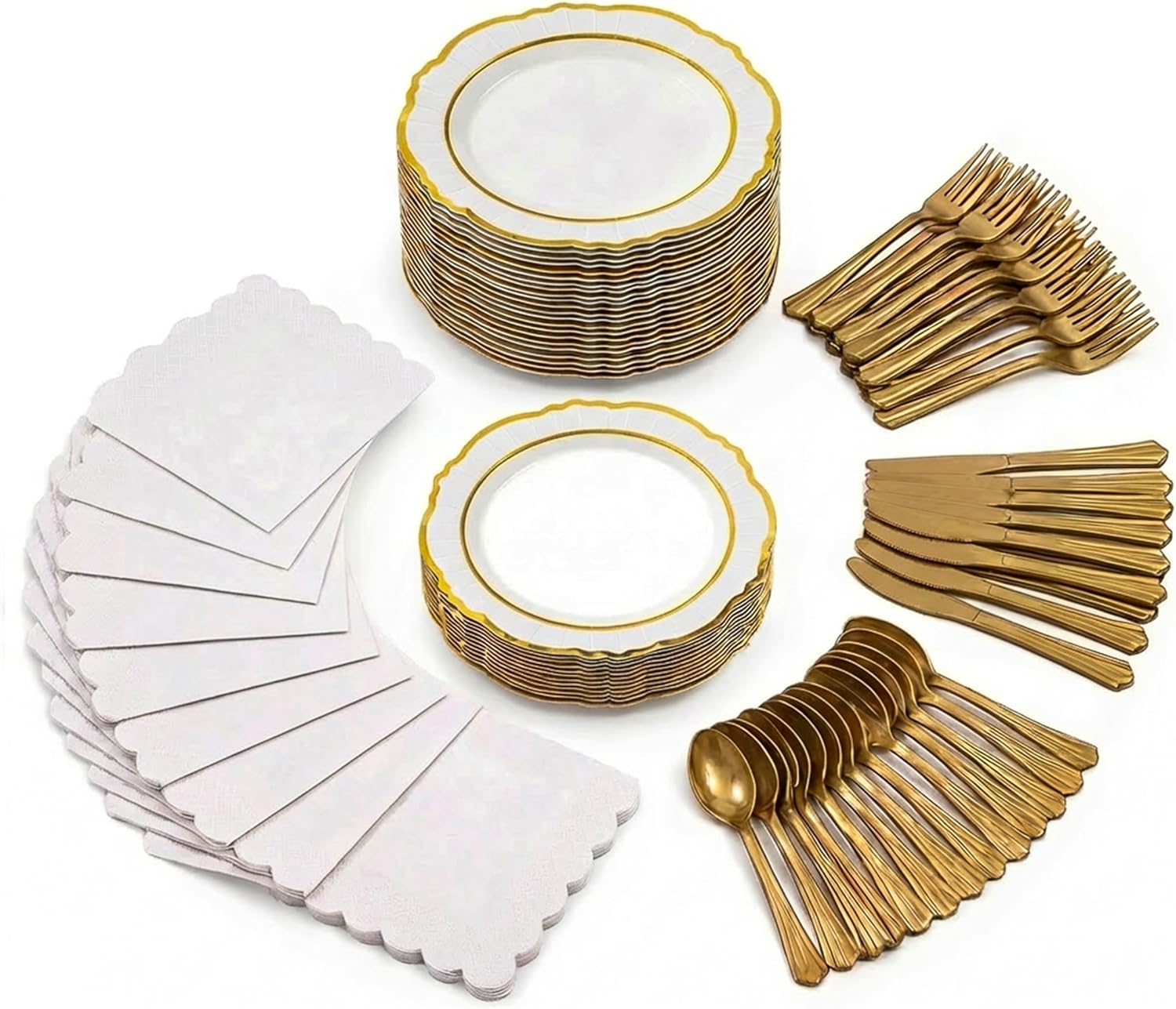 150Pcs Plastic Plates with Gold Rim,Heavy Duty White Plates for 30 Guests,Plastic Dinnerware Set Include 30 Dinner Plate,30 Dessert Plate,90 Gold Cutlery Set as low as $24.69!