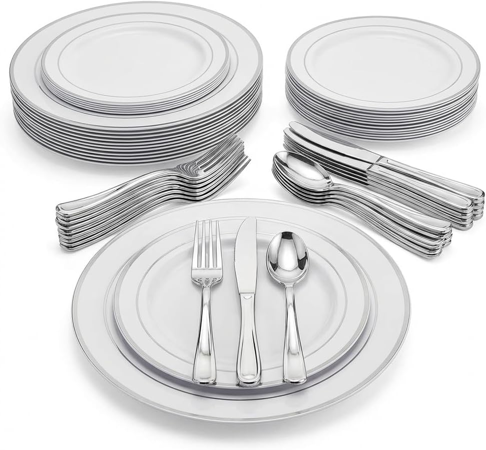 Performore Elegant 125-Piece Disposable Dinnerware Set with Silver Rim – Includes 25 Dinner Plates, 25 Dessert Plates, 25 Forks, 25 Knives, and 25 Spoons as low as $20.89 with S&S, just $21.99 one-time purchase
