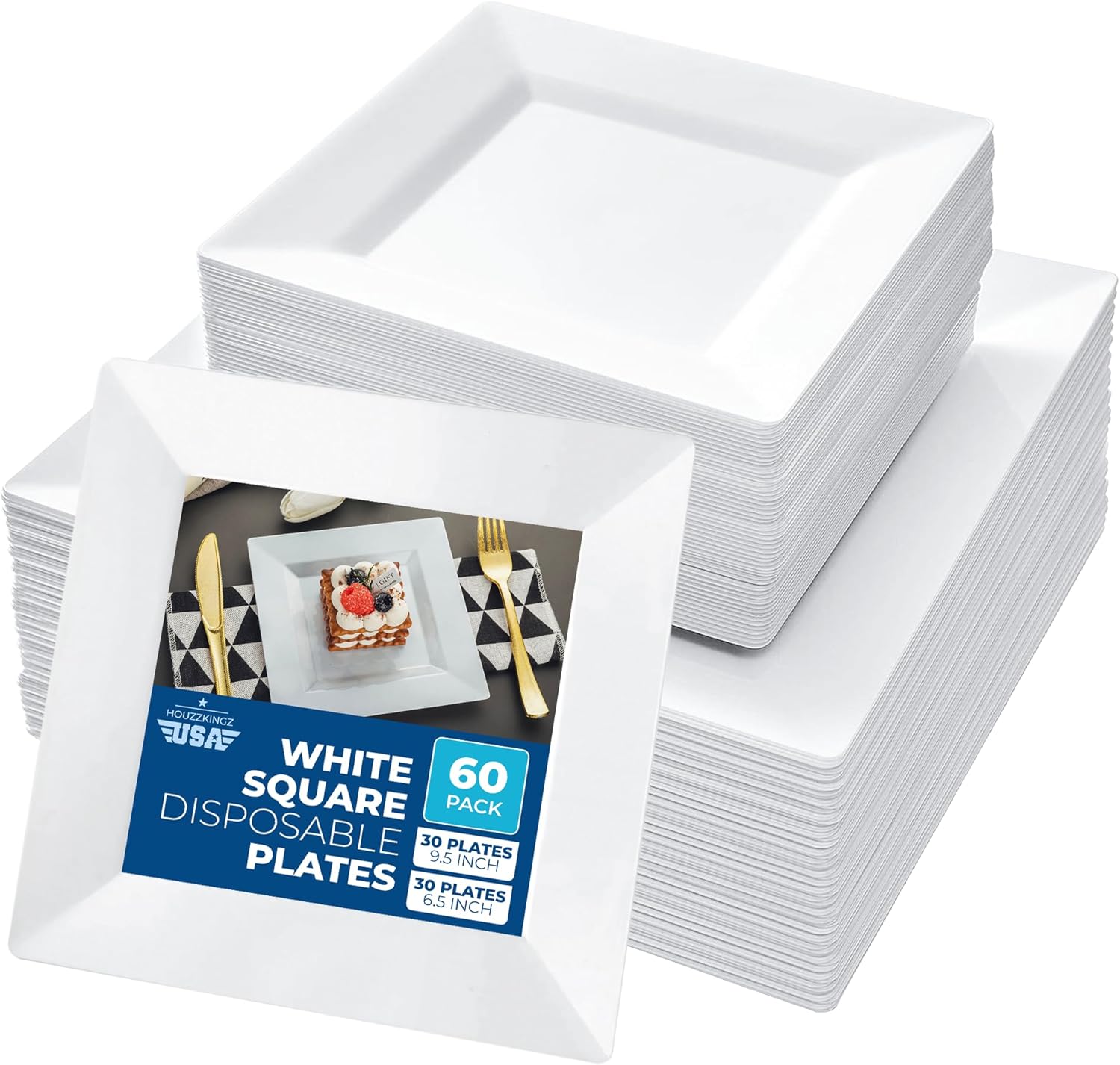 60 Plastic Square Plates for Party – 30 Dinner 9.5″ & 30 Salad 6.5″ White Heavy Duty Disposable Plates Set Reusable as low as $18.99 with S&S, just $19.99 one-time purchase