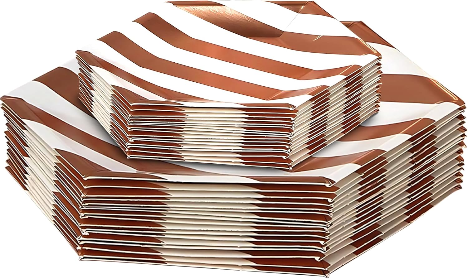 This is paper! Silver Spoons White & Rose Gold Striped Hexagon Disposable Paper Dinnerware Set – 10.25″ & 7.5″ (18 Dinner Plates & 18 Salad Plates) just $4.23!
