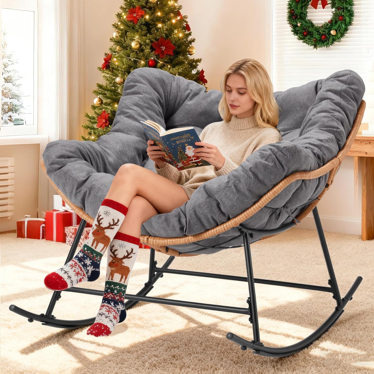 Amazon has this Outdoor Rocking Chair, Oversized Papasan Reading Chair Indoor with Thick Cushion, Comfy Rattan Rocker Egg Chair for Patio, Garden, Balcony, Lawn, Backyard, Bedroom, up to 450lbs, Dark Gray for $199.99 – 50% automatically with promo code T6QFP2HB = just $99.99 + FREE shipping (3rd party seller with a perfect 5 stars over 64 ratings)