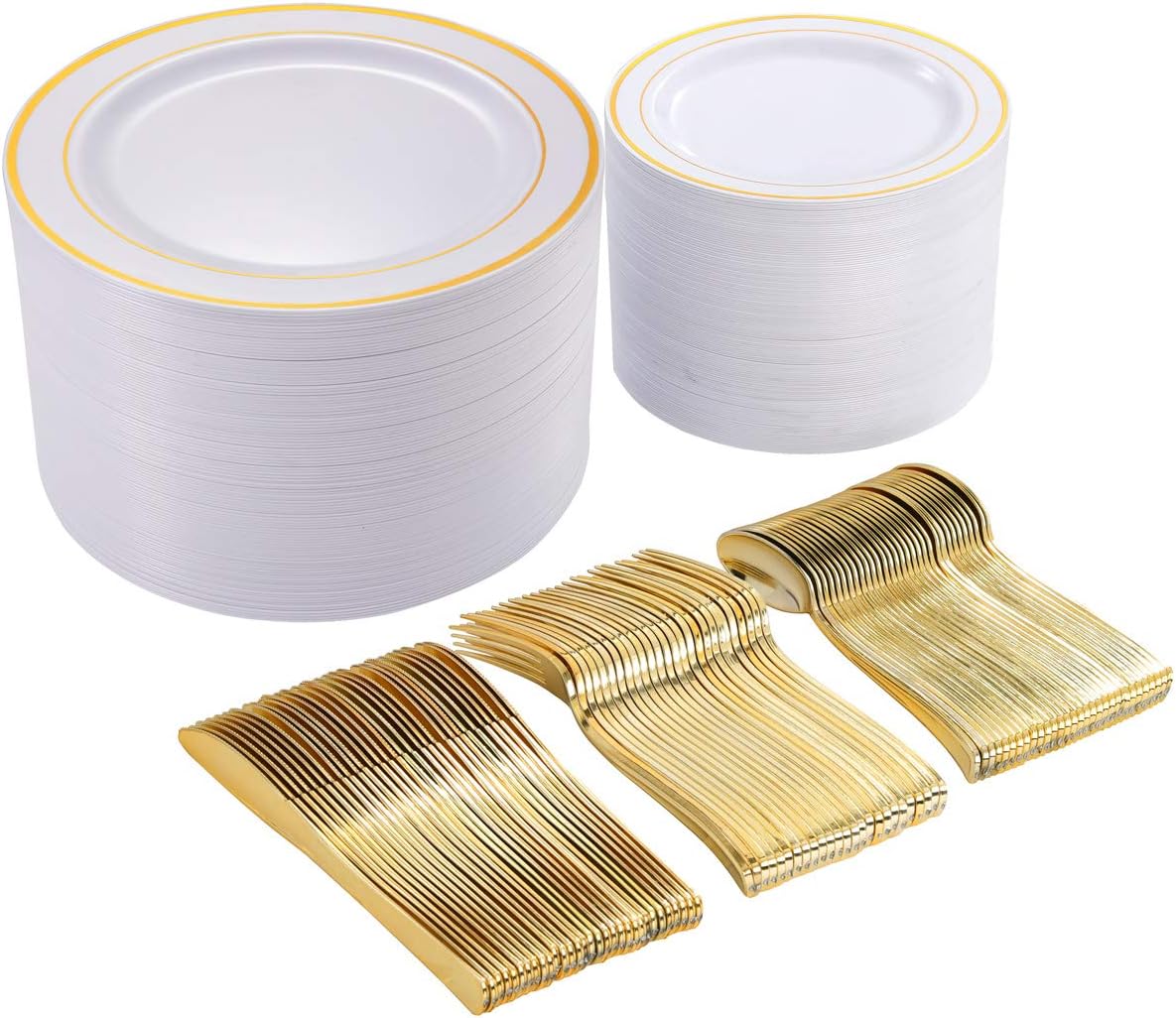 NEW YOUBET 125Pieces White Plastic Plates with Gold Rim-Gold Plastic Silverware-Include 25 Dinner Plates 25 Dessert Plates 25 Forks 25 Knives 25 Spoons for as low as $24.89 with FREE shipping when you clip the $3 coupon + Subscribe & Save