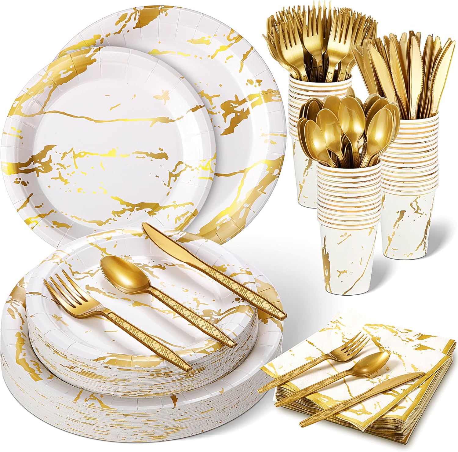 Bokon 350 Pcs Disposable Dinnerware Set Include 100 White and Gold Plates Marble Design 50 Paper 9 oz Cups 50 Sets Spoons Forks Knives 50 Napkin for 50 Guests just $35.99!