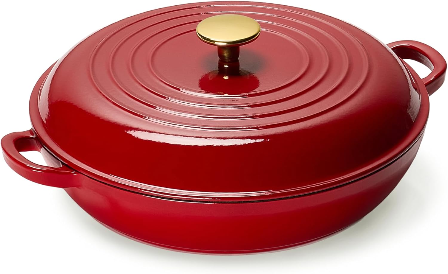 CAROTE 3.5QT Enameled Cast Iron Braiser Pan, Shallow Dutch Oven Casserole Skillets, Non-Toxic Cast Iron Pot with Lid for Grilling, Searing, Baking, Dual Handles, All Stovetop Compatible just $37.99 – Save 53%! 4 Colors