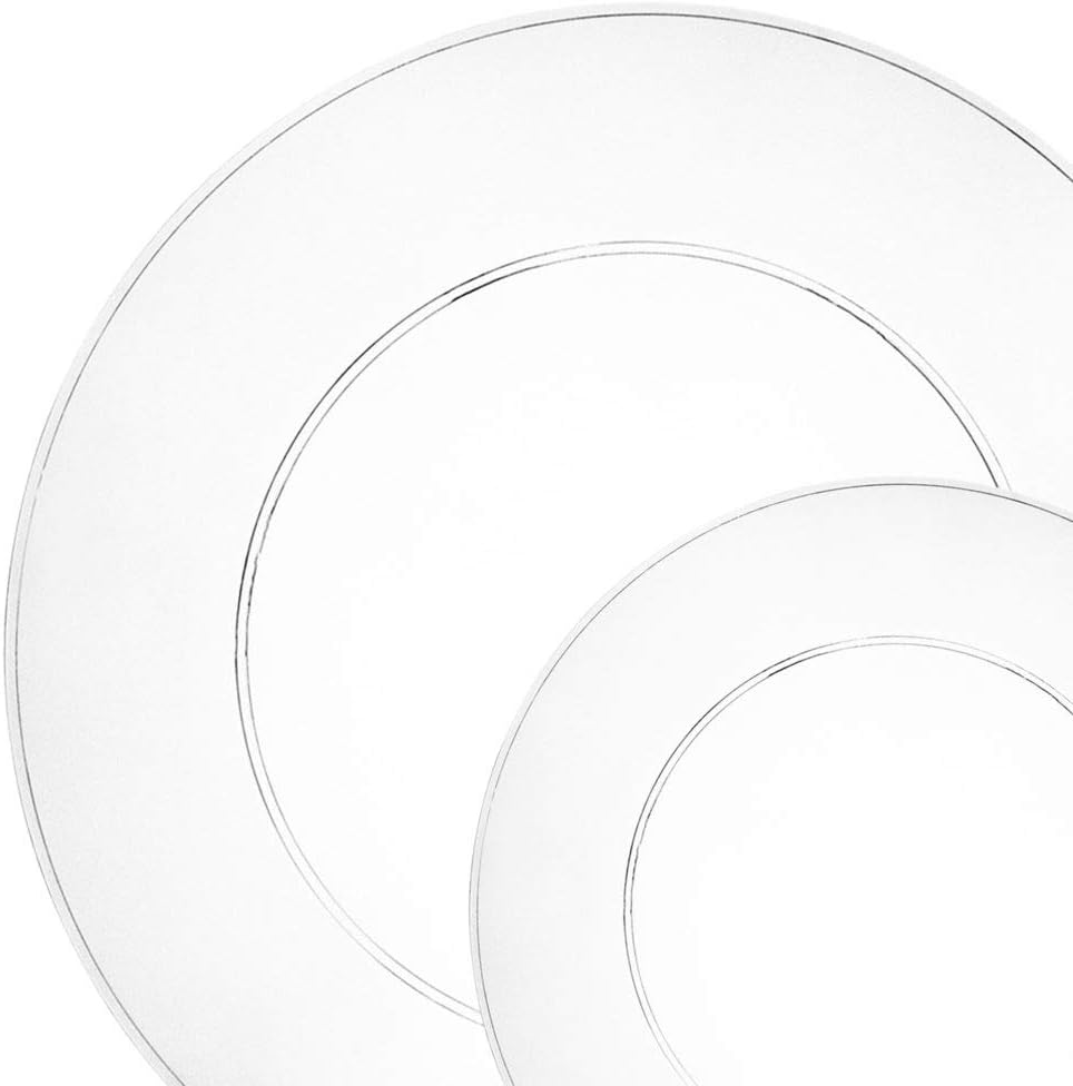 NYHI Elegant Plastic Dinner Plates Set | China Link Disposable Dinnerware Set With Beautiful White & Silver Lace Rims | Plate Set Comes With (25) 10.25” Dinner Plates & (25) 7.25” Salad Plates just $20.49!